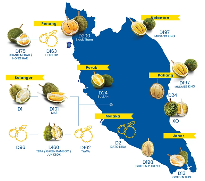 在馬來西亞,大約有200個(gè)榴蓮品種有自己獨(dú)特的風(fēng)味和香氣。同時(shí)它們也對(duì)適宜的生長條件也特定的需要,例如降雨,海拔,溫度和土壤結(jié)構(gòu)。榴蓮僅在成熟季節(jié)才有供應(yīng)那發(fā)生在每年的六月和七月。那個(gè)時(shí)節(jié)成熟后從樹上自然掉落的榴蓮,往往會(huì)含有較多的果肉和更濃郁的香氣。
